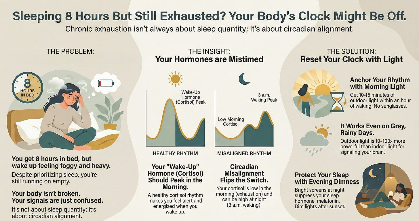 This is just one piece of restoring circadian alignment. In this week's podcast episode, I break down all the factors affecting sleep quality despite adequate duration—cortisol timing, evening light, meal timing, nervous system activation, and what to expect as you implement these changes.