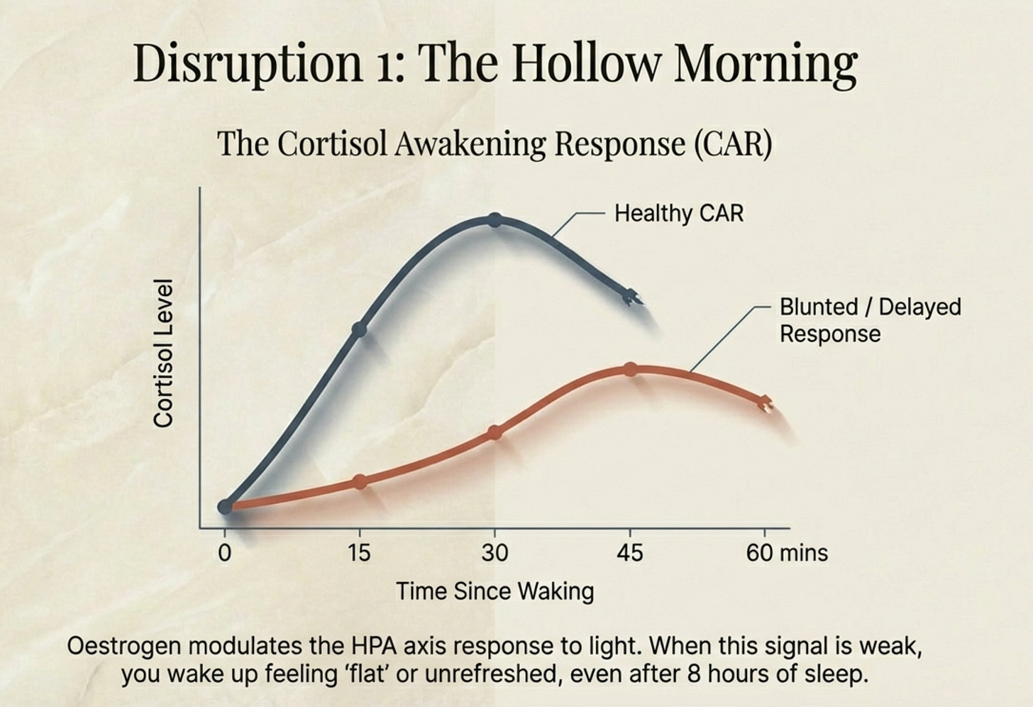 The first is the cortisol awakening response — the sharp morning peak in cortisol that provides your initial energy and sets up the hormonal cascade for the rest of the day. Oestrogen influences how robustly this fires. When oestrogen is less stable, the cortisol awakening response becomes variable. Some mornings it fires well. Some mornings it’s blunted. Some mornings it fires at the wrong time — too early, which is why some women wake at 3am feeling alert when they don’t want to be. The maddening thing is the variability. Not consistently bad, but unpredictable — which is harder to work with than consistent.