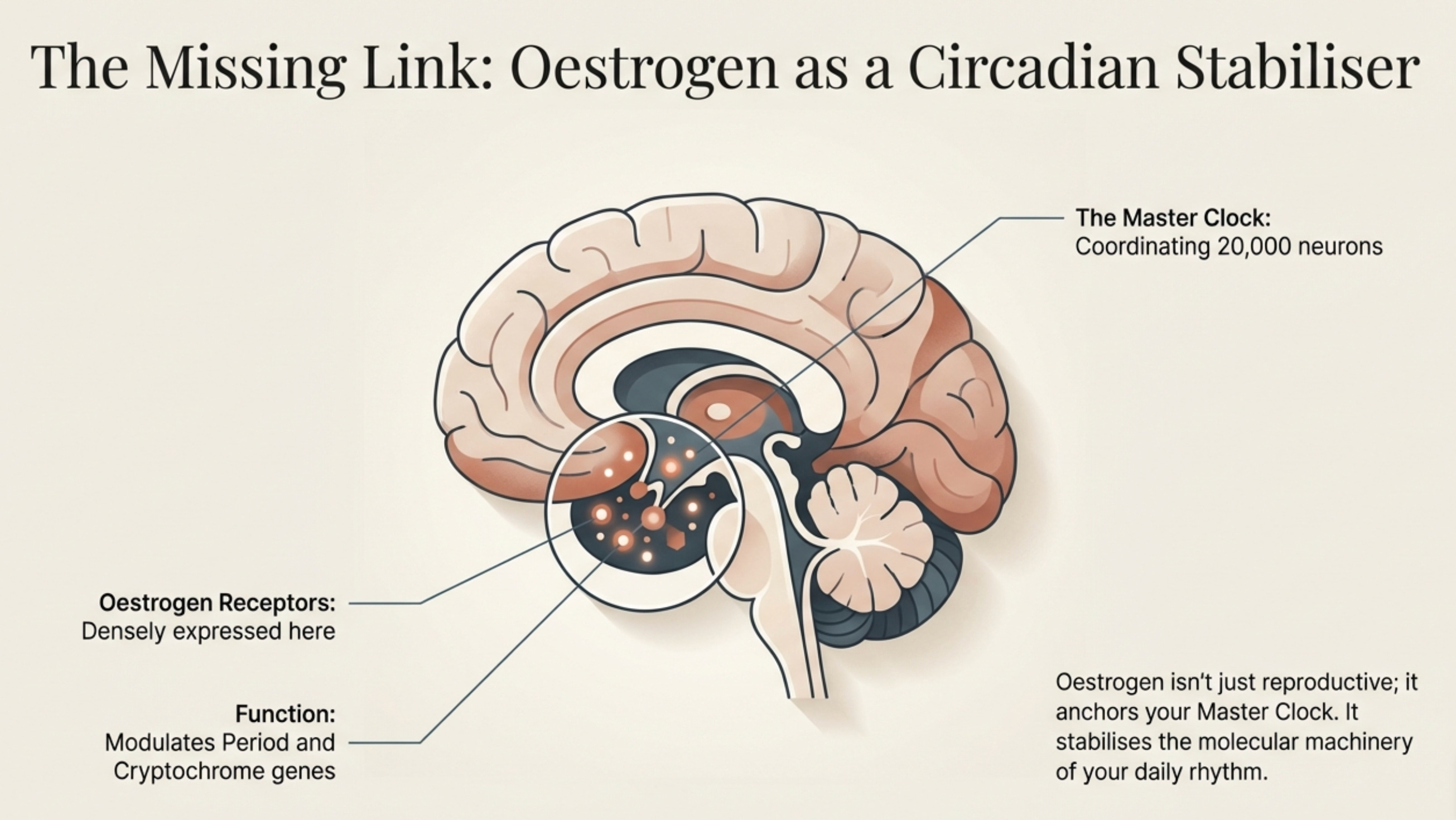 Most of us learn about oestrogen in the context of reproduction — cycles, fertility, bone density, cardiovascular health. All real, all important. What almost nobody mentions is that oestrogen also plays a direct role in how your master circadian clock functions.