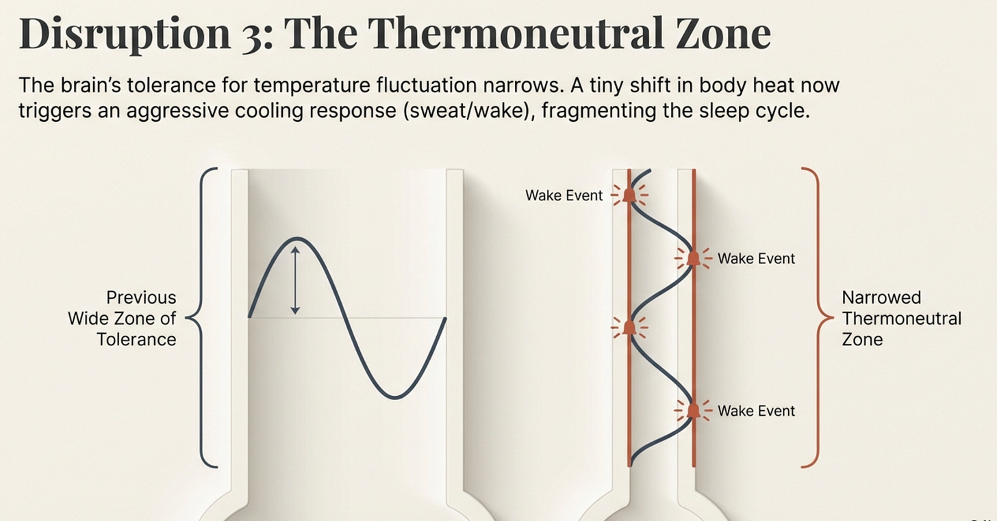 The third is temperature regulation. Oestrogen affects the thermoneutral zone — the range of body temperatures within which your brain doesn’t trigger a strong cooling or heating response. When oestrogen declines, that zone narrows. Small temperature fluctuations that were previously tolerated without a response now cross the threshold. Your body tries to cool down aggressively. That’s a hot flush. At night, that’s a night sweat that wakes you at the exact point in your sleep cycle when the melatonin that should keep you asleep is already less robust.