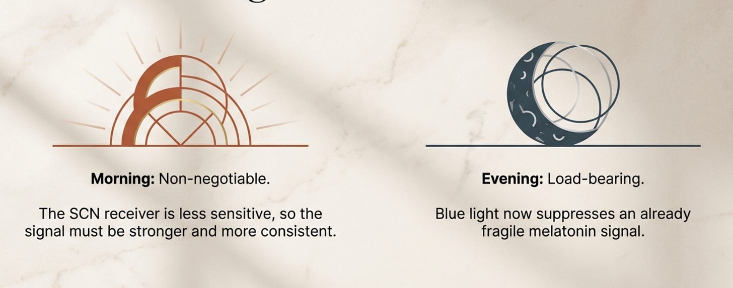 But the system receiving that signal has less internal resilience than it used to have. The clock has lost some of its oestrogenic support, which means the external signals you’re providing are having to carry more of the stabilising load. The threshold for what counts as ‘sufficient’ has moved.