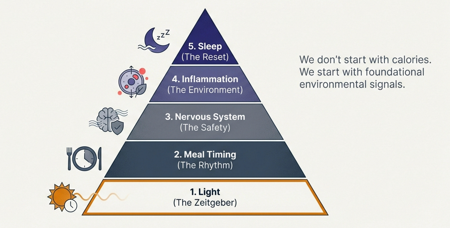 Leptin and morning light is step one. But there are usually 3-4 other steps that need to happen in the right sequence for you to actually feel like yourself again.