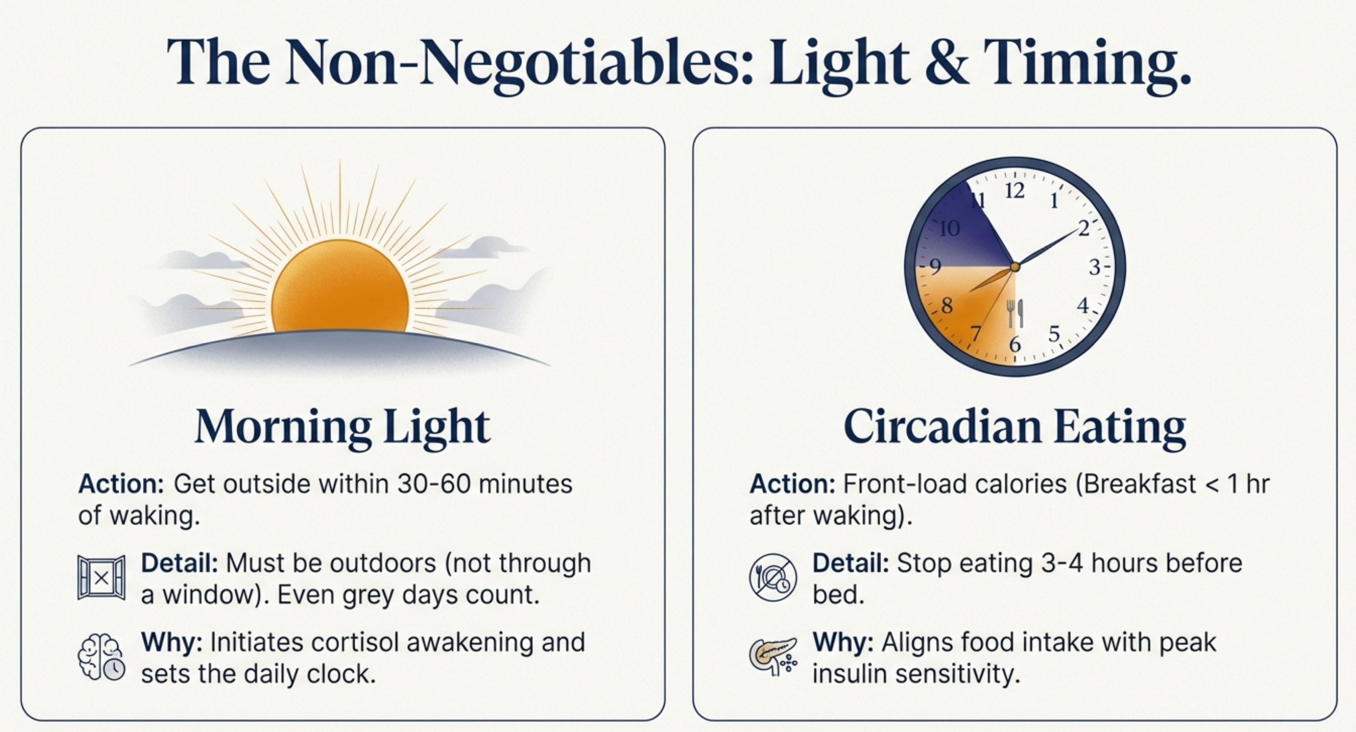 Within the first hour of waking—ideally within 30 minutes—get outside. No sunglasses. 10-15 minutes minimum.