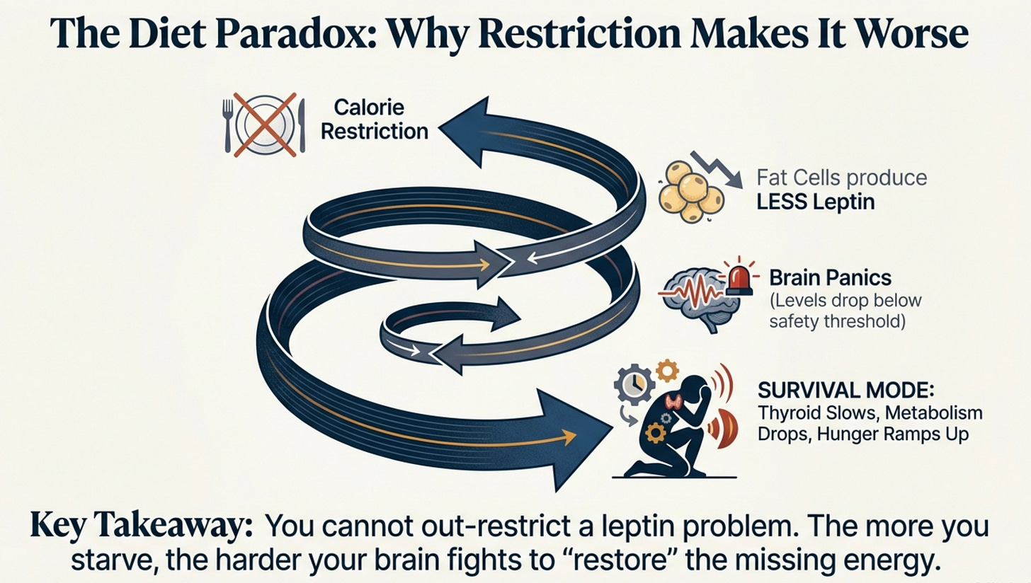 And it responds exactly as it’s designed to: it makes you desperately hungry. It slows down your metabolism to conserve energy. It makes you obsess about food.