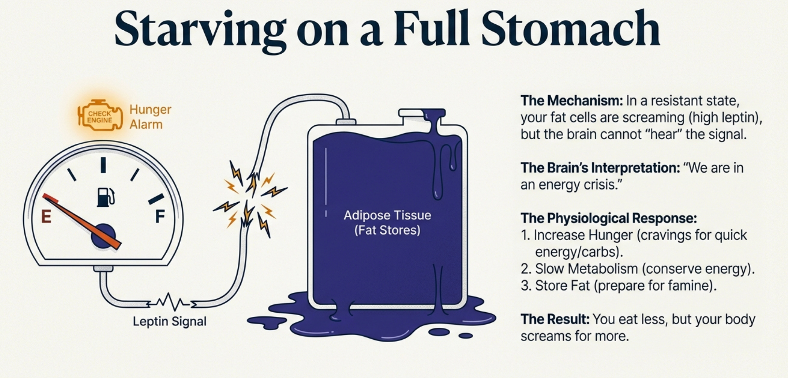 The leptin signal is still being sent. Your brain just can’t hear it properly anymore.