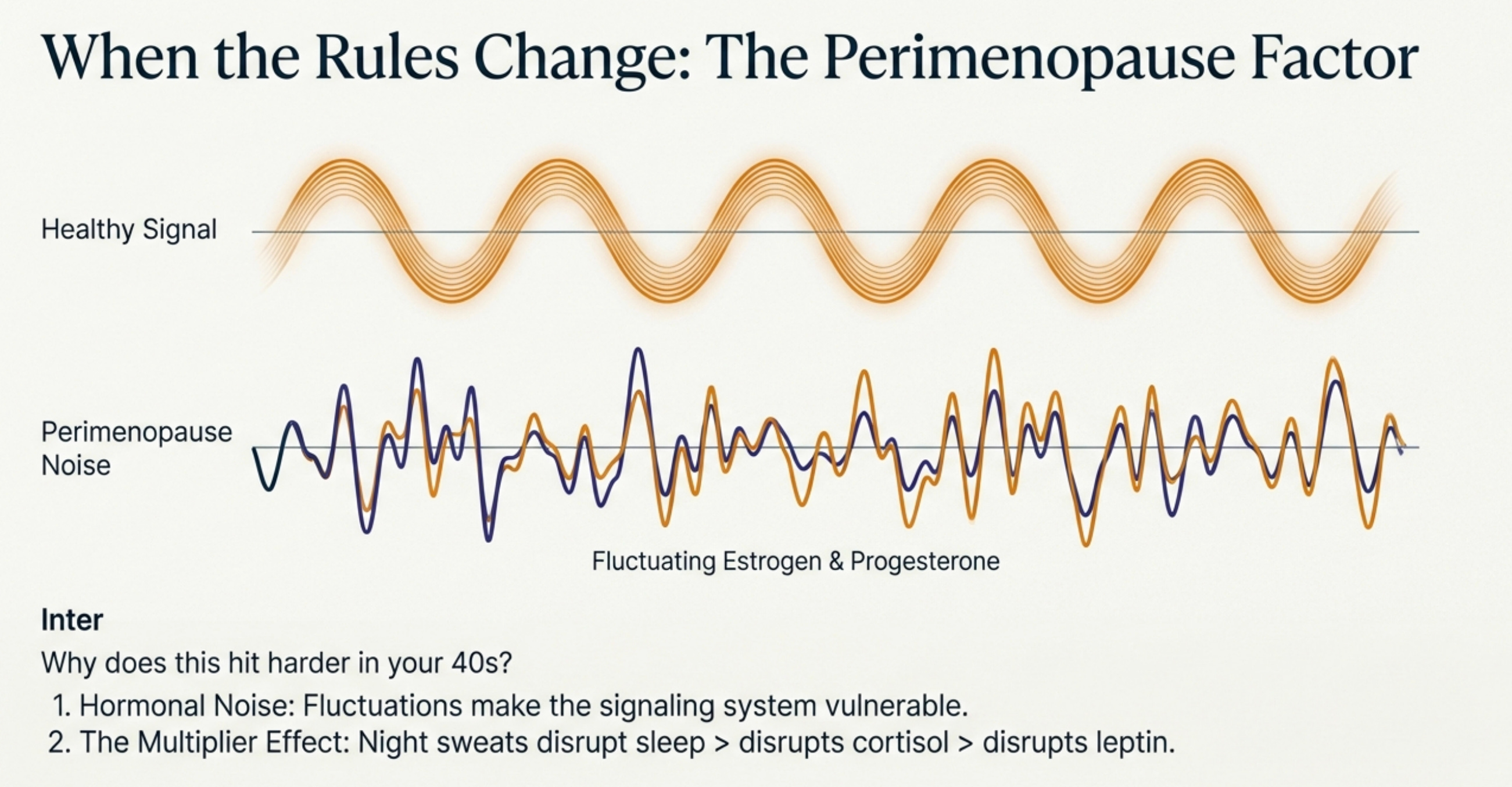 And here’s the frustrating bit as we get older: the same behaviours that your body tolerated in our 20s and early 30s now completely disrupt hormonal signalling.