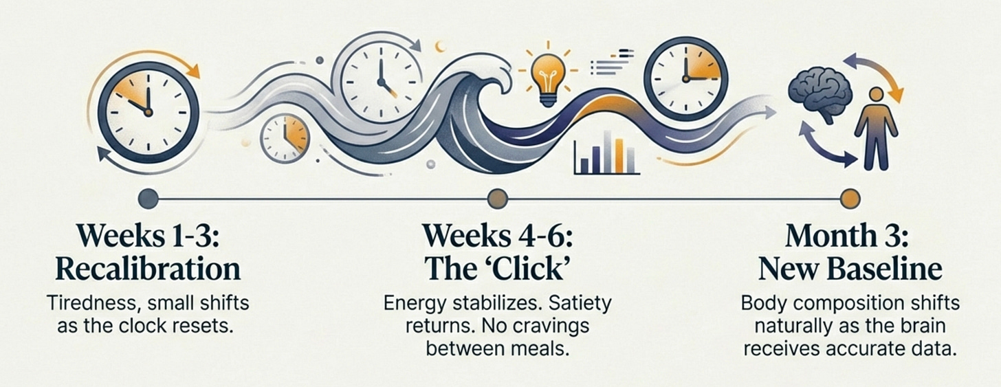 Week 4-6: This is when it clicks. You eat a meal and actually feel satisfied. You can go several hours without thinking about food. Energy more stable. Brain clearer.