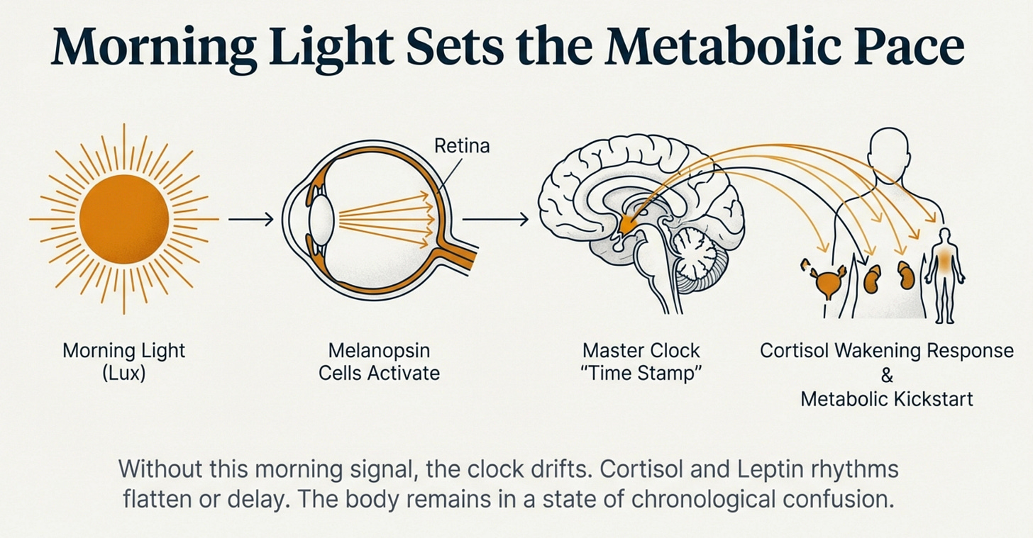 But at a cellular level, your circadian clock is starting to recalibrate. Cortisol awakening response strengthening. Leptin receptors slowly becoming more sensitive.